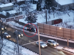 На Рябовском шоссе иномарка повисла на отбойнике