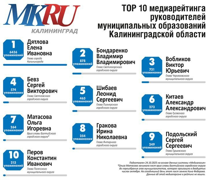 Также в топ-10 вошли глава Гусевского округа Александр Китаев (273 упоминания) и бывший руководитель Балтийского района Ольга Матасова (264). Немного отстали друг от друга руководители Янтарного округа Ирина Гракова и Гурьевского района Сергей Подольский.