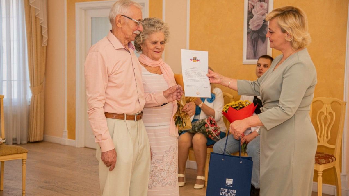 Торжественное событие прошло в мурманском ЗАГСе, где также собрались дети, внуки и правнук супругов-юбиляров.