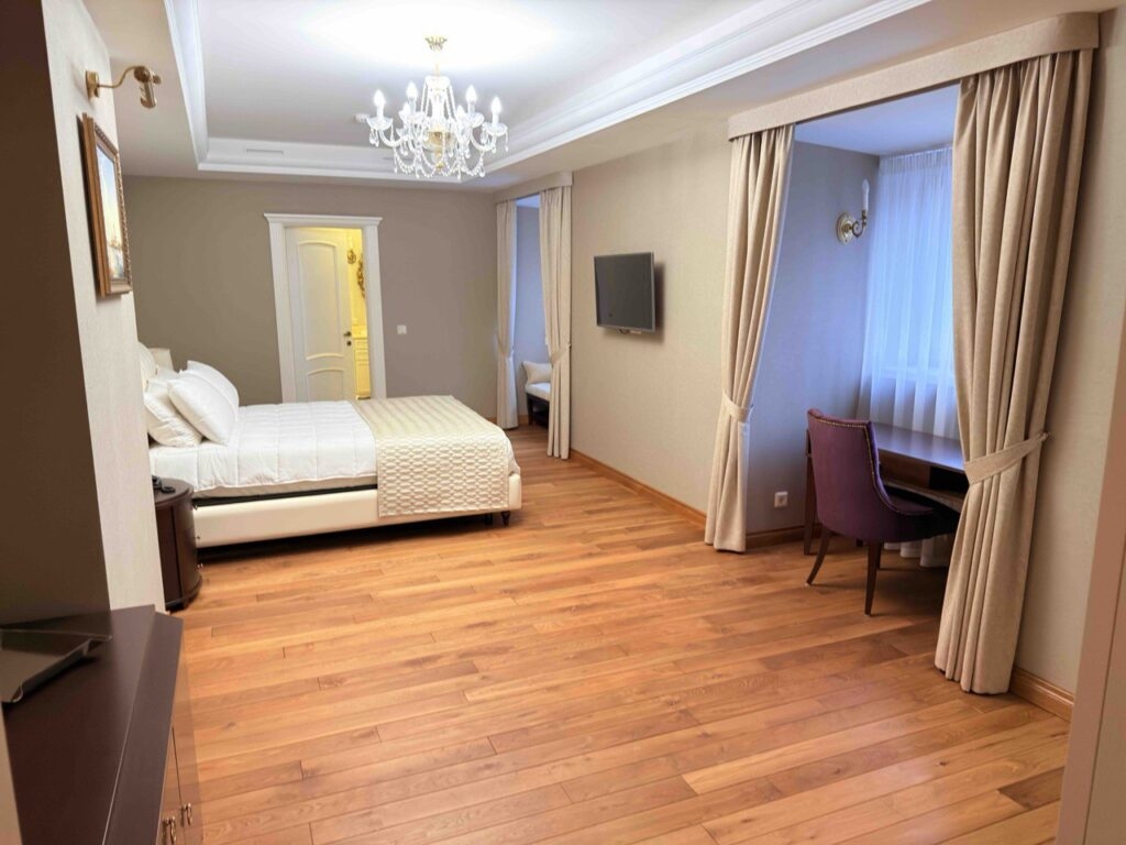 На цокольном этаже оборудованы кухня, винный бар и винотека. Первый этаж отведен под кабинеты для деловых встреч и залы для презентаций, которые подходят и для проведения корпоративных мероприятий. На втором и третьем этажах размещены девять гостиничных номеров. В здании работают системы климат-контроля и видеонаблюдения.