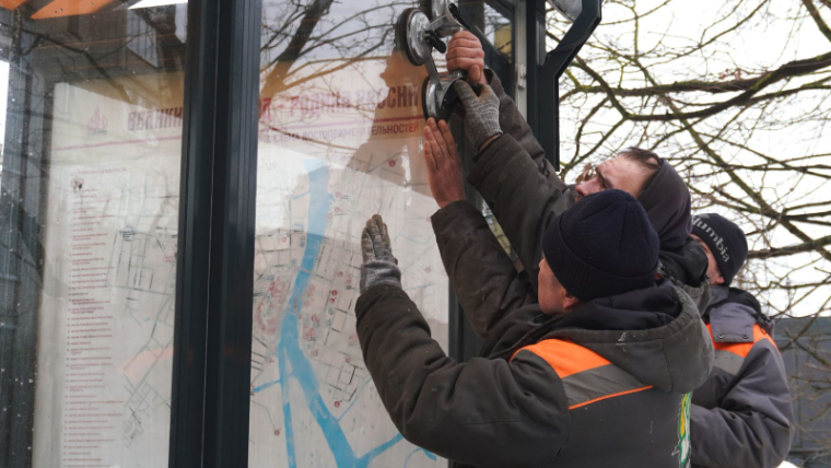 Новгородская область. Сотрудники МКУ «Городское хозяйство» ликвидируют последствия вандализма на автобусных остановках в Великом Новгороде.