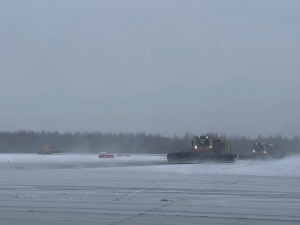 В Санкт-Петербурге в аэропорту Пулково специалисты осуществляют расчистку от снега взлетно-посадочных полос.